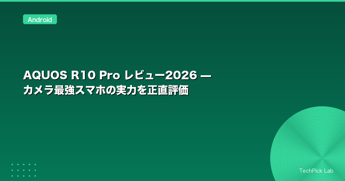 AQUOS R10 ProはシャープとLeicaの共同開発カメラを搭載したフラッグシップAndroidスマートフォンです。TechPick Labでは発売後2週間以上、日常シーン・夜景・動画撮影でカメラ性能を中心に検証しました。結論:カメラの写真品質は国内Androidトップクラス。特にLeicaの自然な色再現とポートレートモードの背景ボケが秀逸です。ただし価格はかなり高いため、「カメラ重視でiPhoneよりシャープブランドを好む人」向けの製品です。(2026年3月更新)
